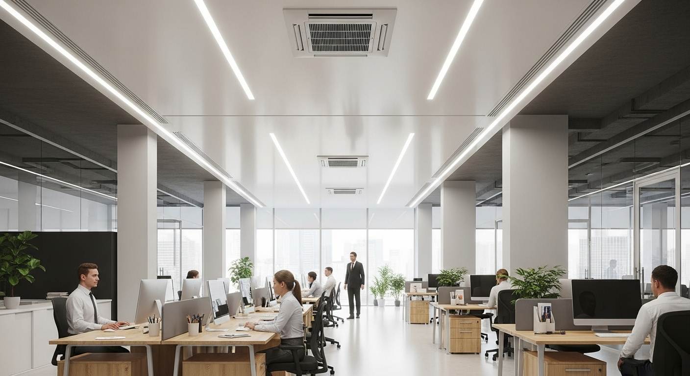 Không gian văn phòng hiện đại với trần phẳng, giấu toàn bộ hệ thống điều hòa trung tâm âm trần