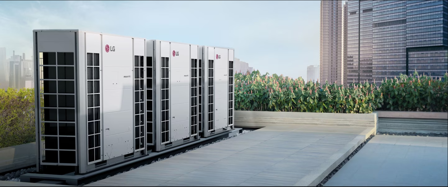 Hình ảnh tổng thể hệ thống VRF LG Multi V với dàn nóng đặt trên mái tòa nhà.