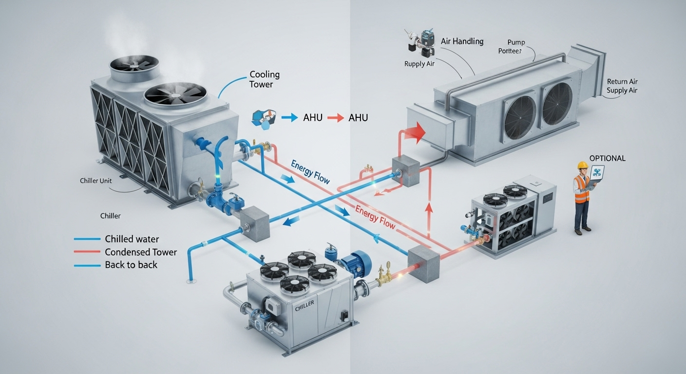 Nguyên lý hoạt động: Chiller (máy làm lạnh nước) tạo ra nước lạnh tập trung tại phòng máy trung tâm (Plant Room). Nước lạnh này được bơm qua hệ thống đường ống, đi đến các thiết bị trao đổi nhiệt cục bộ như FCU (Fan Coil Unit) hoặc AHU (Air Handling Unit) đặt tại các khu vực cần điều hòa.