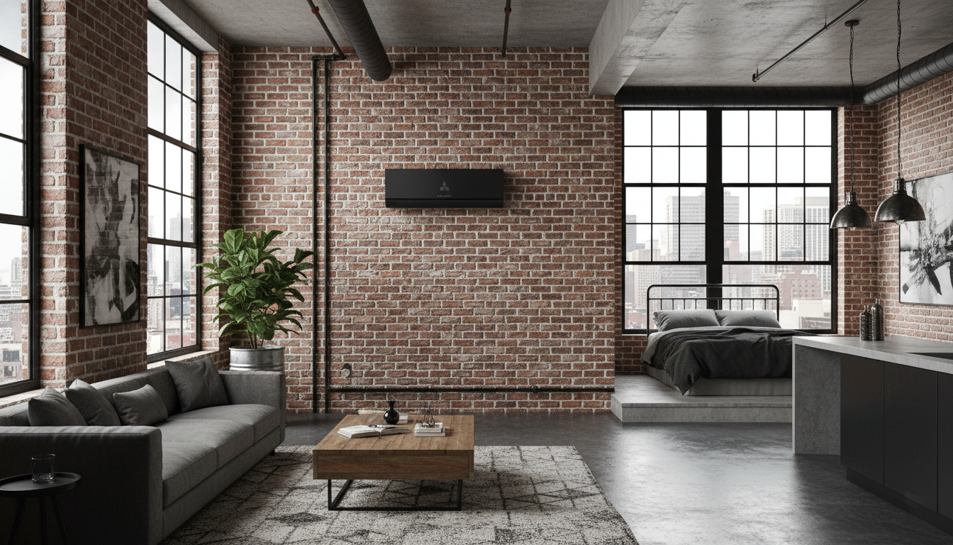 Ảnh chụp thực tế căn hộ Studio cao cấp phong cách Industrial. Chiếc điều hòa Mitsubishi màu đen nhám (Matte Black) được lắp trên nền tường gạch trần, tạo nên sự tương phản đầy tính nghệ thuật.