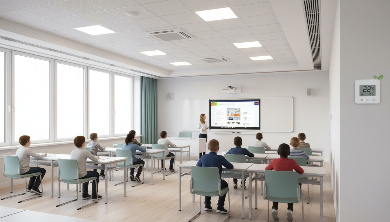 Hình ảnh đồ họa mặt cắt một lớp học hiện đại. Các mũi tên màu xanh lá cây (khí tươi) đi vào qua cửa gió trần, trong khi các mũi tên màu nâu (khí thải, CO2) được hút ra ngoài, tất cả đi qua một thiết bị ERV/HRV nhỏ gọn giấu trên trần. Chú thích: “ERV/HRV đảm bảo nồng độ CO2 dưới 1000 ppm mà vẫn giữ nhiệt độ phòng ổn định.”