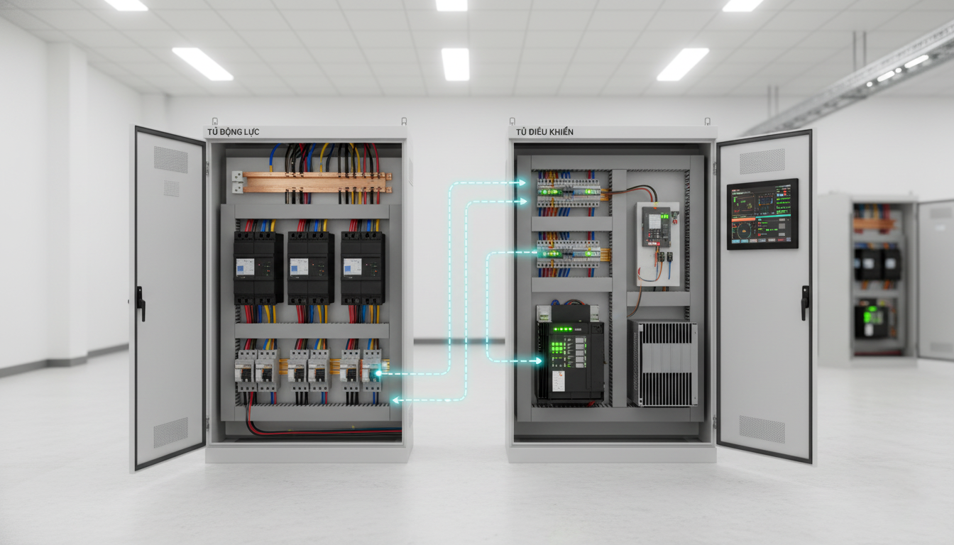 Tủ Điện Động Lực và Tủ Điện Điều Khiển hoạt động trong một mối quan hệ cộng sinh không thể tách rời để tạo ra một hệ thống vận hành hoàn chỉnh.